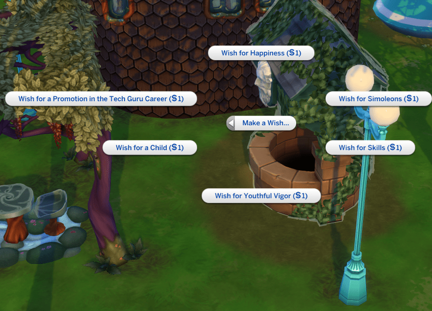 That wishing well is peak Sims chaos machine—a literal $1 slot machine for happiness, children, or immortality. The thing looks like it eats quarters and spits out curses.